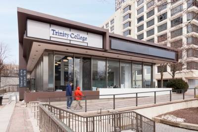 Finished in 2017 by JCJ Architecture, The Liberal Arts Action Lab is located at 10 Constitution Plaza in Hartford's business district. Students utilizing the Action Lab work to build research projects in collaboration with their peers, Trinity faculty, and local community groups and organizations. The goal of the building and program is to better integrate Trinity into Hartford, as well as attempting to address local issues through a liberal arts approach.